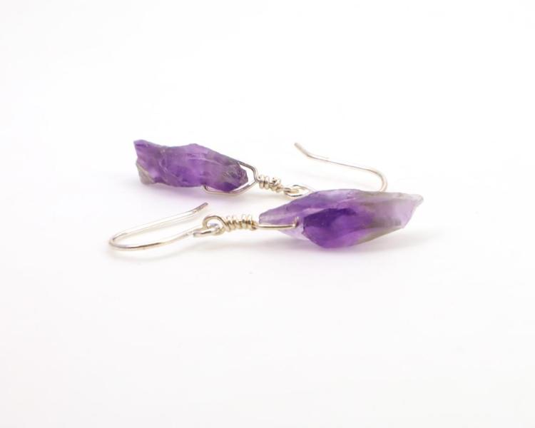 Amethyst is usually cut or polished to make beads, pillars, wands, spheres or faceted gemstones. Above are nuggets that have been tumbled and drilled. These earrings are in my shop.